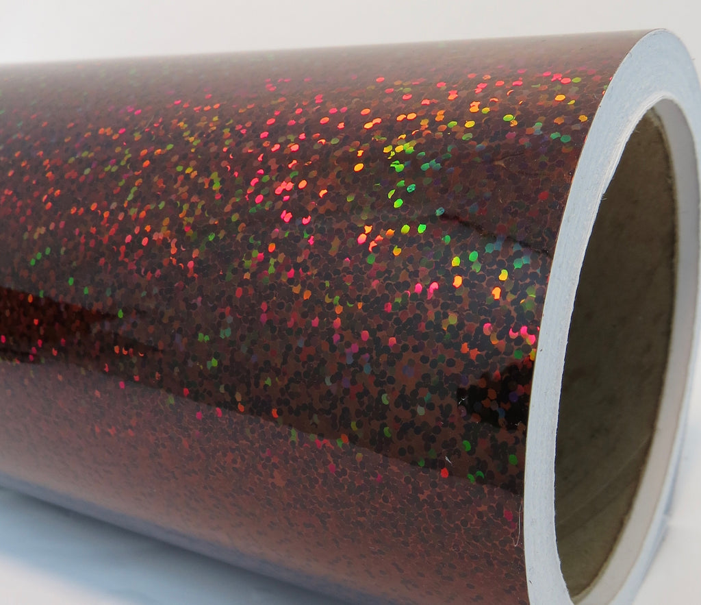 Each roll of vinyl is 24 inch long by 150 feet in length. This vinyl has a waterproof adhesive on the back side. A paper liner is peeled off the back to expose the adhesive surface. Will stick to most clean, smooth surfaces. Often used for numbers, letters, signage, crafts, lures, auto and truck graphics. The vinyl sparkles when moved, the sparkles are irridescent, the break up light into other colors. This vinyl tape contains NO actual glitter flake, they are just an holographic interpretation of glitter.