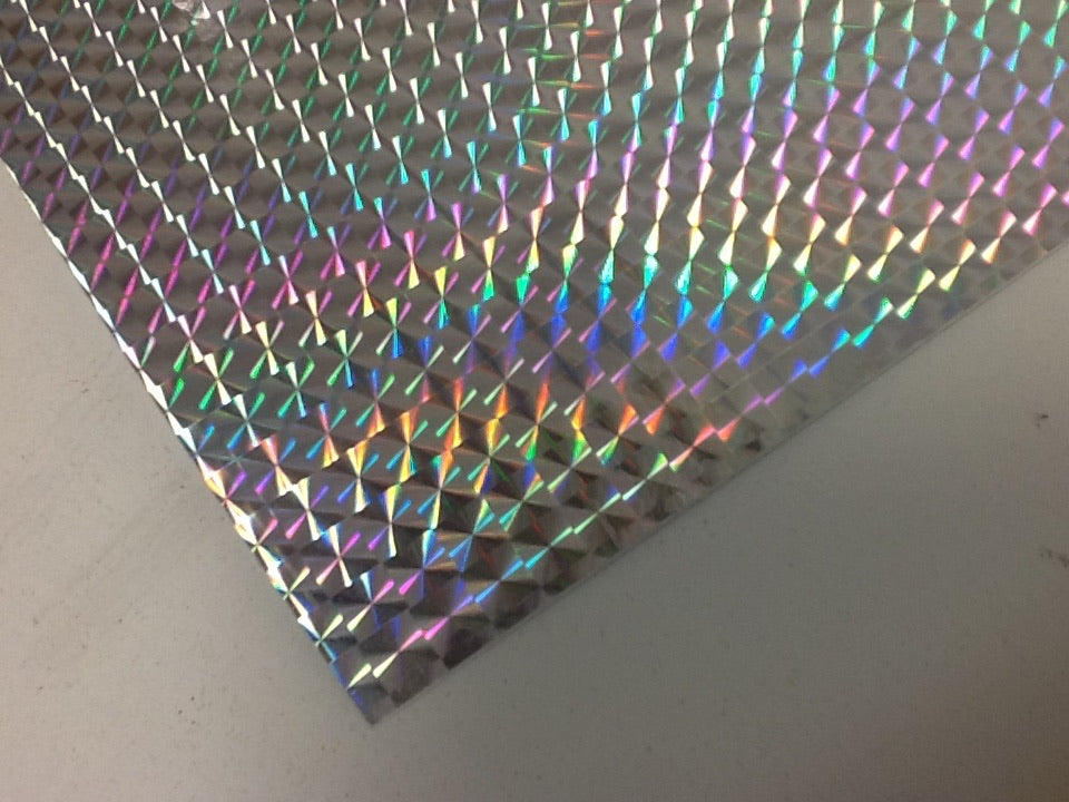 Long-Life Silver Holographic 1/4" Mosaic Vinyl 24 inch wide by 30 feet in length. 5-year outdoor rating. Pattern is 1/4 inch mosaic squares. Holographic diffraction is irridescent, changes color with movement or changes in viewing or lighting angle. This is a premium metallized cast vinyl, coated with adhesive on the back side. Av peel and stick product. Other colors and widths available. 3 mil thick vinyl cuts and weeds well on Stikas, rolands, gerber, and other computer controlled vinyl cutters.